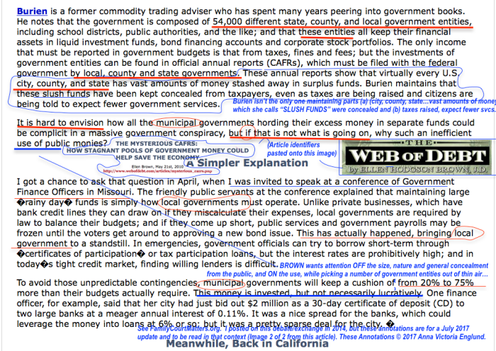 State-Run Banks? At Least Two Activists Who Understand CAFRs, How Governments Stockpile Assets, Take Polar Opposite Stances on What to Do About It (Burien, Herman). And Perhaps Why.. [Published 7/17/2017] » EHB Web of Debt 2010May21 `..Mysterious CAFRs-Stagnant Pools of Govt Money~(Image 2 of 2, partial article) Sshot 2017July15 @3.20PM
