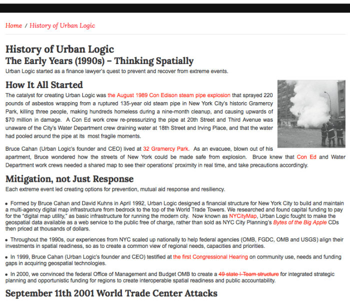 Click image for Urban Logic website. Context — Bruce B. Cahan (UL founder) has been promoting state-run banks, as “championed” by “Web of Debt” author Ellen H. Brown. His “stateownedbanks.com” is down, but this may have some of the archives. Meanwhile, note background and details, emergency prep, governmt involvemt in geospatial mappings for critical services, etc. (He was working in NYC during 9/11). Image added to my 7-17-2017 post.