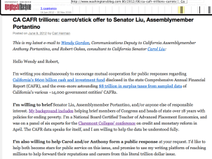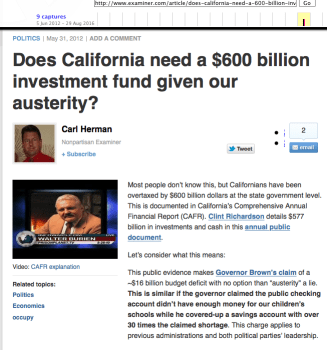 5/31/2012 Carl Herman in “Examiner.com” (archived) citing Clint Richardson on $577B in California’s CAFR (presumably for 2011) and Burien video on CAFR explanation, then proceeds to recommend state banking, further down.