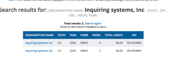 Name-search on “Inquiring Systems Inc” only produced two results because the other ones lacked the suffix “inc” in their labeling. a closer look shows different EIN#s (one ends 840, the other 890. Both begin with “99.” BOTH appear to also be the wrong #. Compare to handwritten sample Form 990 nearby image.