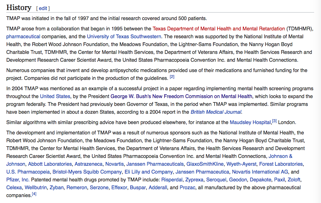 Texas Algorithm Project “wiki” (click image to see) also references the whistleblower and “New Freedom Commission on Mental Health” connections (i.e., from Texas governor George W. Bush to U.S. President George W. Bush (pls. read if unfamiliar with it!) [NOTE: WIKI References insufficient: 2 link to CCHR, one to AHRP (which quotes Rutherford Institute (VA, John Whitehead), link broken and no search site there. AHRP doesn’t post its financials (which I looked up to verify its statement that whistleblower Alan Jones was on its board) and I found a tiny and irregularly-filing NY entity, no Forms 990 [vs. 990EZ] showing (which’d show date founded) before ab. 2008, no return found readily before then either (perhaps filed Form 990-N). A 4th Wiki “Reference” viewed, it said, 2006, and not well framed, misdirected to a site MHC on “trucks” and the one to “Texas Dept. of Health” lacked specifics, leading readers to flounder (there are algorithms for many different diseases, not just the psychiatry-related ones for which TMAP became so (IN)Famous.