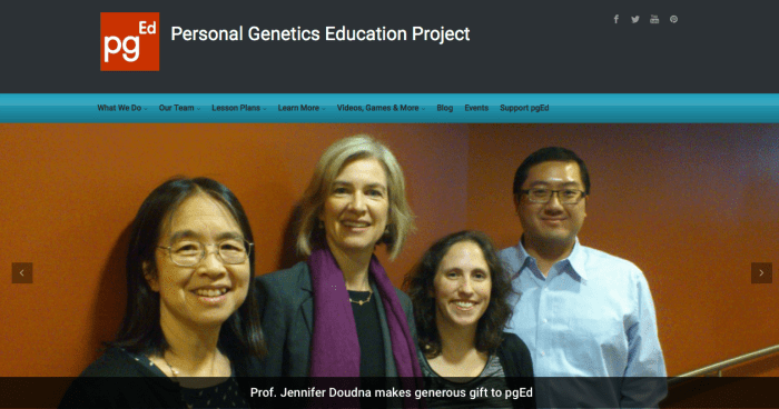 PgEd.org home banner (a Project of Harvard Med. School Dept. of Genetics) says it got a generous contribution from UCBerkeley’s (See “Doudna Lab”) Professor Doudna (Harvard + MIT’s and TBF’s “The Broad Institute” meanwhile warring with UCB (and Prof. Doudna) over CRISPR patents). No caption, no date on the pix…how “educational.”
