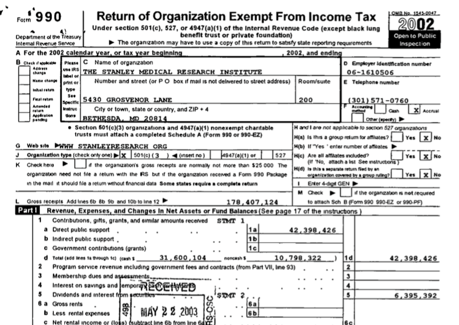 The Broad Institute (MIT, Harvard, TBF*, 2008) and Stanley Family Foundation (see MBI, Inc.)-funded Center for Psychiatric Research (“schizophrenic, bi-polar”) Testing and Treatment Advocacy (“TAC”) and Gene-Editing (CRISPR-Cas9) USPTO Patent Wars with UCBerkeley et al. (written 6/15/17, posted 7/23/2017) » SMRI StanleyMedResrchInstitute Form 990s FY2002 (EIN#061610506 BethesdaMD) (See-Also Broad Inst+its Stanley Fund) SShot 2017Jun14 @7.28.02 PM