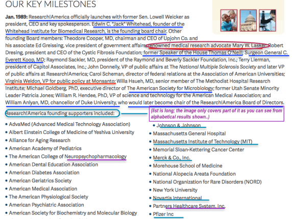 I put that discussion (several annotated images from its timeline) towards the bottom of the post, but it will pull together, I believe other parts of the narrative in a timeline. The website gives a timeline of events, and shows how many other foundations (incl. Bill & Melinda Gates, Robert Wood Johnson, and others, and not a few Congressmen, were involved, and spinoff organizations (at least two 501©4s) in pulling this off. Where I found this information was on a multi-page, all-text, highly linked (although some have expired) and detailed tracking of networked families, companies and foundations, especially related to the anti-smoking campaign (American Cancer Society), America Heart Association, and pushing money towards biomedical research. I spent hours (in fact, a full work day just reading, not writing) looking at this after the first exposure nearly a week ago, when I looked at certain parts of it.