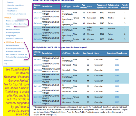 ~|~ And several images + a table tax returns, because of their support of the Human (and “Personal”) Genome Project, the Coriell Institute for Medical Research (formed 1953, it says, in Camden, NJ). They provide the Biobank, cell lines (and more), funded by, currently it says, seven NIH awards.