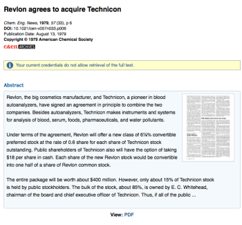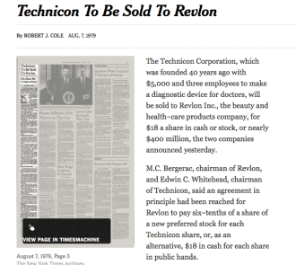 Here’s an 8/29/1979 abstract (and short news item) Revlon agrees to acquire Technicon at C&EN News, ACS (American Chemical Society) again emphasizing, Whitehead owned most of the stock, however, public shareholders could opt for cash. It also again states what Technicon did. Reading more than this abstract requires “credentials you do not have” or $10 for 48 hrs access. So, abstract only, it is (and that’s © 2017 ACS):