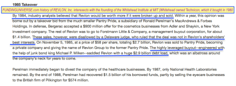 Then there was the 1985 takeover by “Pantry Pride” as it turns out, an “LBO” (leveraged buy-out) helped with junk-bond pioneer Milliken (who later did two years in jail for securities violations; a legendary situation) saddling the company with over $2B debt after which Perelman began selling it off. That’s the 1980s for you… (see annotated image).