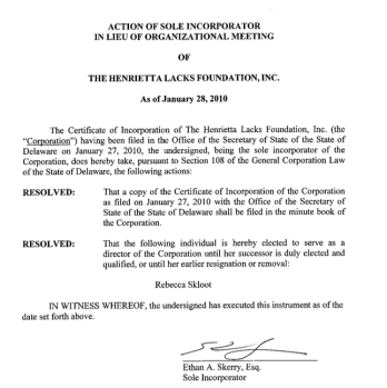 This link to one-page “Sole Incorporation” statement provided on “The Henrietta Lacks Foundat’n.” website.