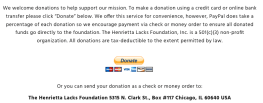 Through IRS exempt organization select check (link just added to my “Vital LInks” menu on blog sidebar), I found the other years were filed — all as Forms 990-N declaring revenues under $50K. Meanwhile, the website say send checks to Chicago, IL — but its sole incorporator (Ethan Skerry, Inc.) did so (Dec. 10, 2010) as a Delaware Corporation, and Rebecca Skloot can be contacted (probably her publishers) in NY, and the website designer (“Being Wicked, LLC” which website also gave no clue as to “in which state”) was by a two-person LLC formed in North Carolina, one of the managers being a (white) South-African ex-pat “by way of the UK” web designer and photographer (Lorissa Shepstone) with a degree from Arizona State, if I have it right. This NC LLC was only formed in 2013…I think they did a good job, just wish that any organization soliciting funds would cough up their EIN# and legal domicile.