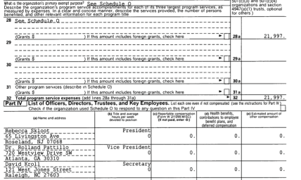 p.2 showing (on Form 990Z) two major sections, one of which prompts for Grants as a subset of Expenses — and nothing is filled in. It also says in fine print that certain kinds of orgs. (which this is) MUST fill in expenses. There’s no need at this point to use “See Sched. O” option, but someone did (and Ms. Skloot’s signature is on the form). Note only shows 3 directors, in three different states. Here, author’s address isn’t ℅ another firm as on p.1.