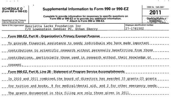 That’s odd. I realize it’s a minor point compared to the rest of this post, but it’s attention to these types of details (whether entity is small and recent, or BIG and recent — or older) that have, like the HeLa cells, and the involved descendants and family of Ms. Lacks, an important story to tell, so I’m posting the excerpts. I may never get back to this organization — but the book was made into a movie with Oprah, and the lack of revenues and incomplete filing of its lone full-sized return is odd.