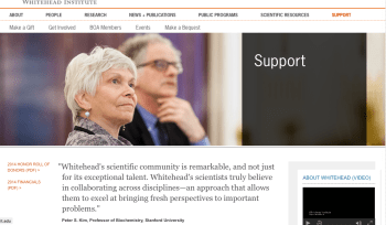 A third W.I. image I’ll provide is from the Support Page, again featuring large pictures, lots of white space, and the “prestige appeal” — the more you pay up, the more privileges you get to learn about the Institute…$2,500-$10,000 is (only) “BOA” Board of Associates, but $10K+ is “Laboratory Partners” and you get to affiliate with (one) lab and greater access to it and its scientists (from the on-line giving community). The mentality is exclusive, special community of supporters, elite, etc… For example, under Board of Associates Page ($2,500 will get you there):