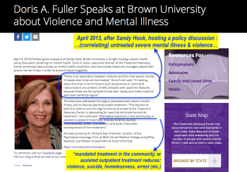 TAC images for LGH 7/31/2017 post – Doris A. Fuller Bio Blurb (#1 of 2, images), possibly from LinkedIn or TAC website. Describing her time at TAC, it also shows its purposes, and references her experience as a mother. I have found no reference in (very basic, just name) search results to any father, or her daughters’ siblings. Notice the reference how her daughter’s battle with mental illness (severe bipolar with psychosis)still, apparently, further helped the TAC cause. || PERSONAL COMMENTARY, LGH: As a mother, I empathize, but otherwise I am concerned whether or not the treatments were not part of the problem. I have not spoken out too much on this blog about my own daughter/s situations, but at the point I had major concerns, I had already been ousted (family courts, failure to prosecute child-stealing) from active involvement (or even contact) in their lives, and in that context, I DO realize the background of trauma and abuse, at least witnessing it, involved; which causes me to wonder about funded promotion, nationally, of these diagnoses. AGAIN (reminder, in earlier post referencing “NAMI”, NAMI claimed 1 in 4 persons has a mental illness. TAC (and Dr. Torrey) do not agree, BUT they still advocate for mandatory (i.e., against a person’s will) treatment, including drugging, for “persistent severe mental illness”