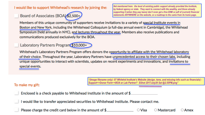 Who? (Besides Harvard, MIT and Other Boston-area Institutes) is Funding and Promoting/Soliciting for Personal Genomics (volunteer your personal, identifiable, genetic code for the PGP, a global database to be shared internationally) — GET Research (fine-tuning and equipping the Nature vs. Nurture debate) as Essential for Global Public Health? (publ. 7/31/17) » 07 Whitehd Institute’s Website (design, tone, and missing info such as financials) – Support~>Donor Form~>BOA or Lab Partner? SShot 2017July29 Sat @2.55PM
