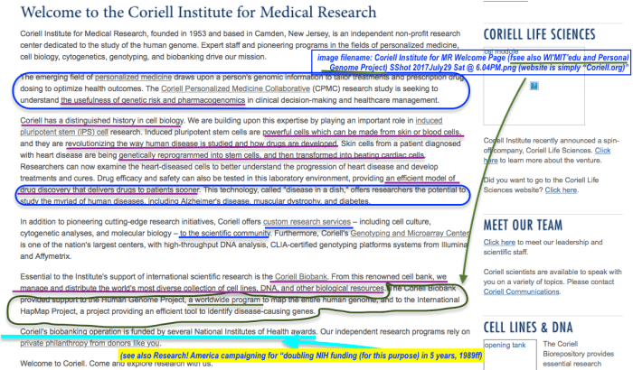 Who? (Besides Harvard, MIT and Other Boston-area Institutes) is Funding and Promoting/Soliciting for Personal Genomics (volunteer your personal, identifiable, genetic code for the PGP, a global database to be shared internationally) — GET Research (fine-tuning and equipping the Nature vs. Nurture debate) as Essential for Global Public Health? (publ. 7/31/17) » Coriell Institute for MR Welcome Page (fsee also WI’MIT’edu and Personal Genome Project) SShot 2017July29 Sat @ 6.04PM