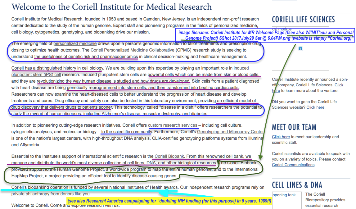 Who? (Besides Harvard, MIT and Other Boston-area Institutes) is Funding and Promoting/Soliciting for Personal Genomics (volunteer your personal, identifiable, genetic code for the PGP, a global database to be shared internationally) — GET Research (fine-tuning and equipping the Nature vs. Nurture debate) as Essential for Global Public Health? (publ. 7/31/17) » Coriell Institute for MR Welcome Page (fsee also WI’MIT’edu and Personal Genome Project) SShot 2017July29 Sat @ 6.04PM