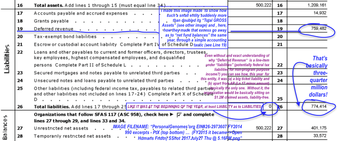 PersonalGenomes.rg FY2014 990, Pt X Balance Sheet, “Liabilities” excerpt. Click image to enlarge or here for the whole return.