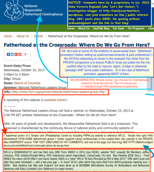 Fine-print annotations on this view of NRFC (fatherhood.gov) explains that NFLG (referenced there) as of that date only ONE tax return found so far, it’s been IRS revoked and re-instated, and other important info. Click this image to see full-sized as pdf.