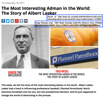 Mary Lasker with Albert D. Lasker. His third wife (her second husband; first had owned an art gallery, marriage didn’t last long). There appears to be something of an age difference… They married 1940; he retired (selling? Lord & Thomas) in 1942, which sale funded their foundation ($45M). L&T became Foote, Cone & Belding. By 1952 he was dead from cancer, which diagnosis (this article says) Mary kept from him…. (image of the Laskers from CBCRadio.com article, below).