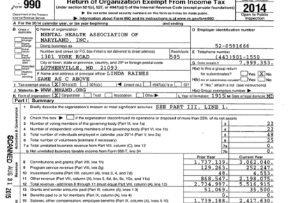 | Mental Health Association of Maryland | MD | 2014 | 990 | 39 | $3,513,206.00 | 52-0591666 |
