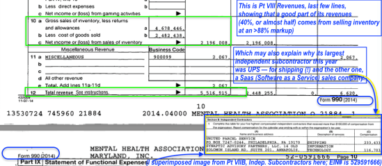 MHAMD.org, Form 990 excerpts, FY2014 (=calendar yr), EIN# 520591666, Image 6 of 6 (not necess in order) showing where the profits are being made (88% market up of inventories sold; they are running “Mental Health First Aid” trainings…