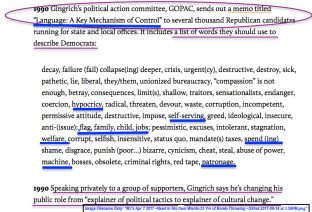 From Newt in His Own Words: 33 Years of Bomb-Throwing, 4/7/2011 in Mother Jones, by by David Corn & Tim Murphy, Image 2 of 2 – “LANGUAGE a Key Mechanism of Control”