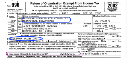 Meanwhile, I don’t see that in FY2014, MHAMD.org’s tax return acknowledged $512K of program service revenues anywhere. In fact, they only showed about half that which the tax returns categorized as “training fees” — doesn’t sound like the “fulfilment” description given by “The National Council” entity above on its tax return. (excerpt from its first page showing summary info):