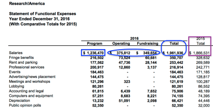 I also showed by images from its history timeline the consistency of this goal, and from its comparative 2015-2016 audited financial statements (on the website) that its main source of revenues, by far, was “Dues.” ($1.3M as opposed to all other categories well under $1M). Where did the dues go? Same statement, apparently majority ($1.9M total 2016) to salaries. (see image). But, in size that of course is dwarfed by the Whitehead Institute, which itself is also dwarfed in size, obviously, by the NIH budgets pushing similar themes…