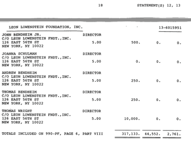 She’s involved with Brookings (Trustee) Princeton (BA Economics, 1977) and Harvard (MBA, 1979) and the Leon Lowenstein Foundation. (See all-text, B/W image below, and table of tax returns for the foundation).