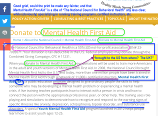 Looking in 2017 August at the same website, this time around I did find an incorporated entity because (it took some real hunting, as financials are NOT posted), an EIN# was eventually divulged for the “National Council on Community Behavioral Healthcare, Inc.” (earlier designation, website shown on tax returns: “BCCH.org”) or as it’s now called, simply “The National Council on Behavioral Health” dba “Mental Health First Aid,” which corresponds to a training program, apparently, they are marketing (one of the “DONATE” images below references it being “brought to the USA)