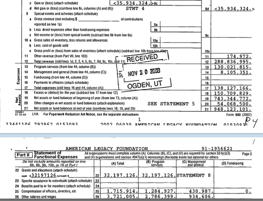 Cont’d from my Aug. 5 post…An Alternate Viewpt. on the Anti-Smoking Campaign and its Syndicated Backers …1998 Tobacco Litigation MSA followed by the 2007 (Opinion) USDOJ RICO [started 8/7, published 8/19/17 + updated since] » Amer’cn Legacy Fndtn (now Truth Initiative Fndtn) since 2015 FY2002 excerpts (incl 35M loss on sale of $8B assets — SShot 2017Aug19 Sat @1.33.50 PM 02