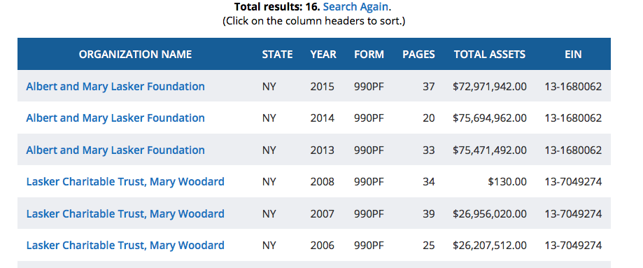Showing Mary Woodard Lasker Charitable Trust which was poured into the other foundation), i.e., both EIN#s (Click image to enlarge)
