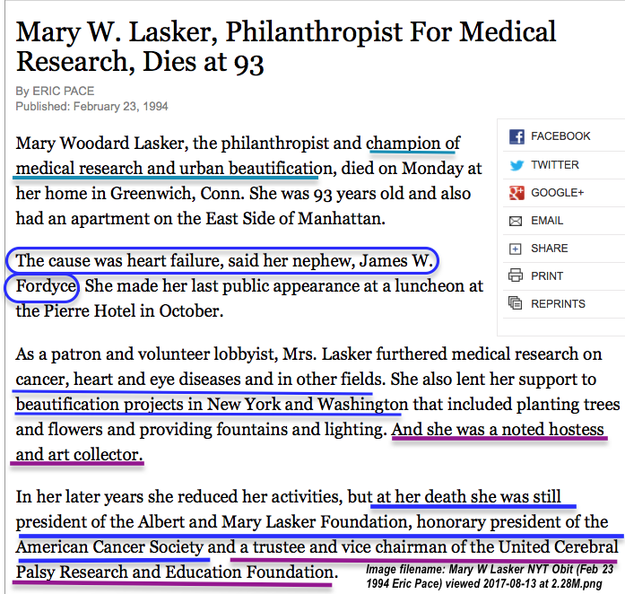 Cont’d from my Aug. 5 post…An Alternate Viewpt. on the Anti-Smoking Campaign and its Syndicated Backers …1998 Tobacco Litigation MSA followed by the 2007 (Opinion) USDOJ RICO [started 8/7, published 8/19/17 + updated since] » Mary W Lasker NYT Obit (Feb 23 1994 Eric Pace) viewed 2017-08-13 at 2.28M