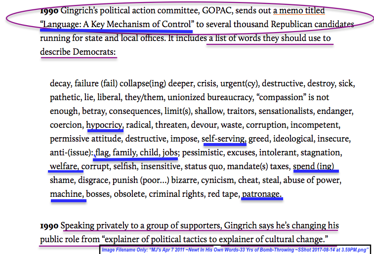 From Newt in His Own Words: 33 Years of Bomb-Throwing, 4/7/2011 in Mother Jones, by _________, Image 2 of 2 – “LANGUAGE a Key Mechanism of Control”
