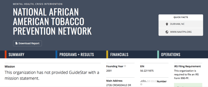 NAAPTN – a Guidestar Listing (see category, top left) gave me an EIN# and said ruling date, 2001, and it’s required to file