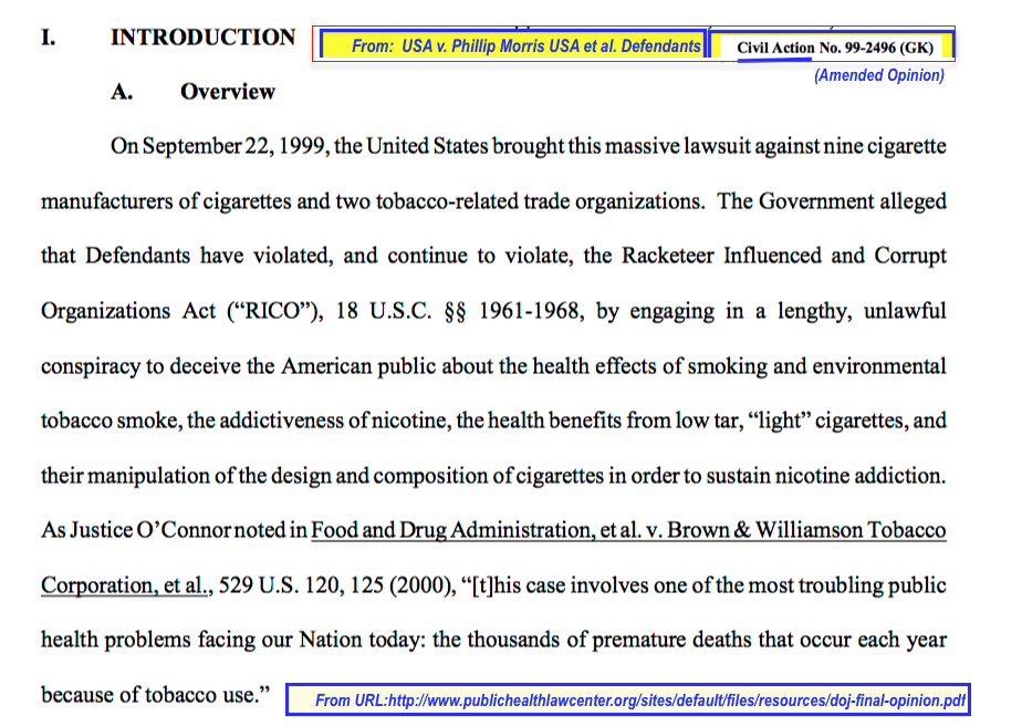 Cont’d from my Aug. 5 post…An Alternate Viewpt. on the Anti-Smoking Campaign and its Syndicated Backers …1998 Tobacco Litigation MSA followed by the 2007 (Opinion) USDOJ RICO [started 8/7, published 8/19/17 + updated since] » USA Plaintiff, Tobacco-Free Kids, American~ Cancer,Heart,Lung, NonSmokersRights+NAATPN, *INTERVENORS* v. PhillipMorrisUSA et al CivilActn 99-2496(GK) [RICO] (Opin2007) SShot 2017Aug08 03
