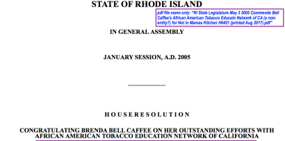 I’m ready to publish now, just about two weeks later (8/28/2017), and have yet to locate any real entity called “CALIFORNIA” “CALIFORNIA’s” or “….OF CALIFORNIA” associated with any “group” by the name of “African American Tobacco Education Network” although it was repeatedly referenced as if it were real. Just one example from within this post: ~RI State Legislature May 3 2005 Commends Bell Caffee’s African American Tobacco Educatn Network of CA (a non-entity?) for Not in Mamas Kitchen H6451 (printed Aug 2017) (two-page pdf, click page icon to see if first click doesn’t produce it. Two annotated images; my comments raise the question of “Who IS it?” and why not mention an real, identifiable entity where one is available instead of one strangely “not found” when looked up?