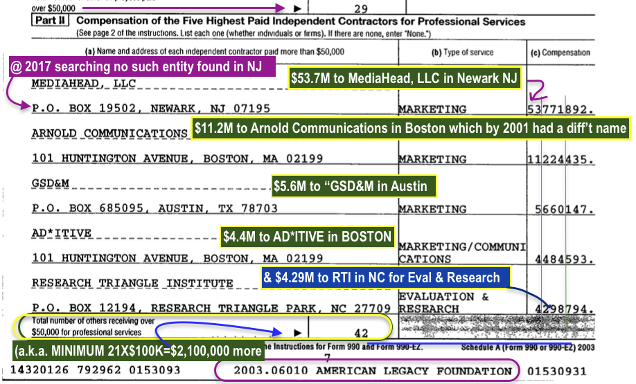 NAATPN, Inc (2000ff, Total Current Assets, $0) and Caffee, Caffee and Associates PHF, Inc. (Hattiesburg, MS, 2003ff, Total Assets $0, Tax Filings Questionable), and others trying to squeeze a California Race-Based Stop-Smoking Network (AATEN) into that recipe. [Publ. Aug. 28, 2017] » American Legacy Foundatn (EIN#911956621) FY2003**Pt VIIB Subcontractors SShot 2017Aug25 @2.52PM