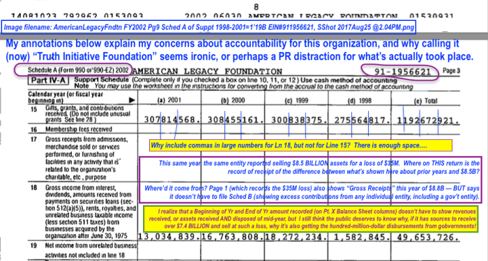 NAATPN, Inc (2000ff, Total Current Assets, $0) and Caffee, Caffee and Associates PHF, Inc. (Hattiesburg, MS, 2003ff, Total Assets $0, Tax Filings Questionable), and others trying to squeeze a California Race-Based Stop-Smoking Network (AATEN) into that recipe. [Publ. Aug. 28, 2017] » AmericanLegacyFndtn FY2002 Pg9 Sched A of Suppt 1998-2001=1’19B EIN#911956621, SShot 2017Aug25 @2.04PM