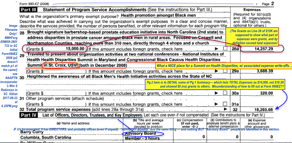 NAATPN, Inc (2000ff, Total Current Assets, $0) and Caffee, Caffee and Associates PHF, Inc. (Hattiesburg, MS, 2003ff, Total Assets $0, Tax Filings Questionable), and others trying to squeeze a California Race-Based Stop-Smoking Network (AATEN) into that recipe. [Publ. Aug. 28, 2017] » BMHI’org EIN#59-3801733 in SC Initial Form990EZ 2008 (p2 doesn’t match p1 of the same!) see NAAPTN incorporator’s Wm S Robinson in SC SShot 2017-08-23 at 6.25PM