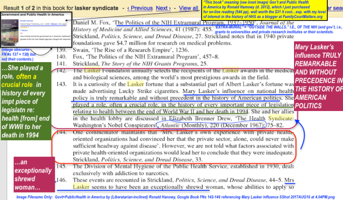 Gov’t and Public Health in America (excerpt of footnotes referencing Mary Lasker influence), book by Ronald Harnowy.