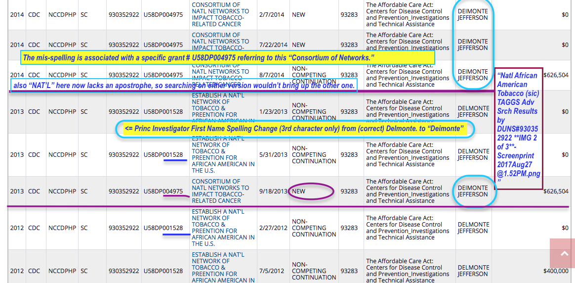 TAGGS srch 21 awards (incl some amount “0”) 2008-2017 representing NAATPN (DUNS# search) IMAGE 2 of 3, see annotations