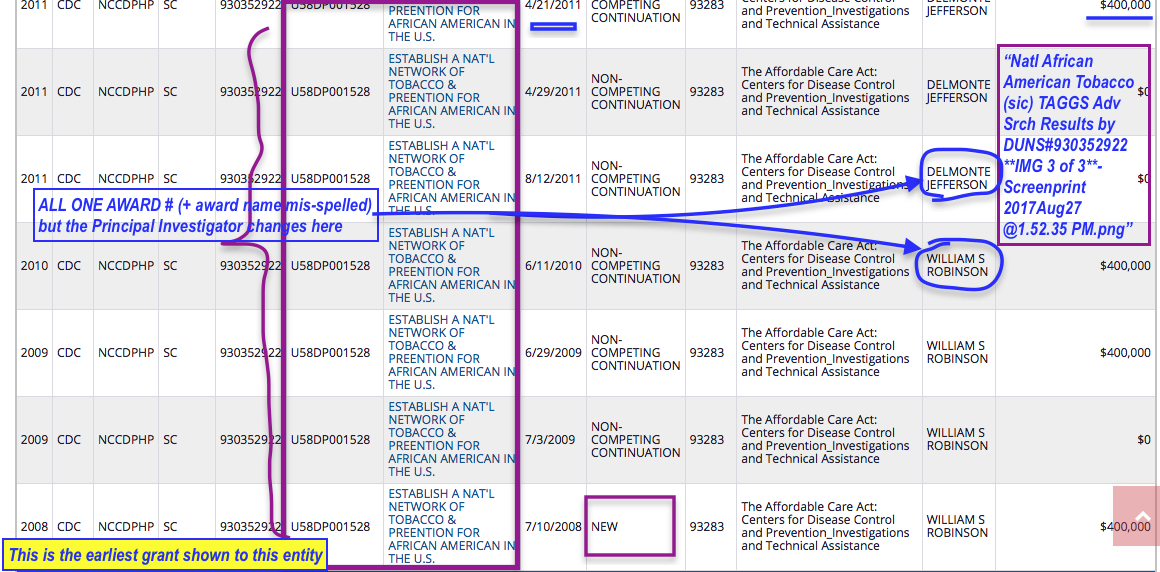 TAGGS srch 21 awards (incl some amount “0”) 2008-2017 representing NAATPN (DUNS# search) IMAGE 3 of 3, see annotations