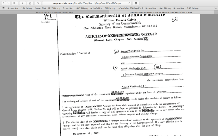 Commonwealth of Massachusetts record (excerpt) showing Arnold Worldwide, Inc. merged into Arnold Worldwide, LLC in Dec. 2001, with the latter as the surviving entity.