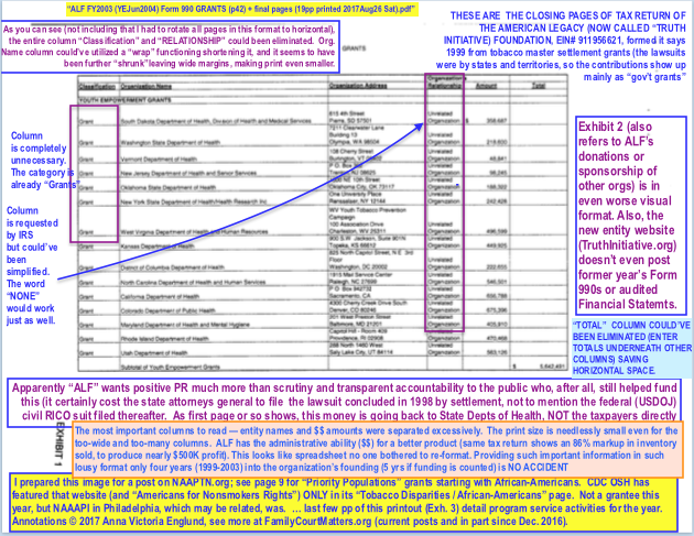 (The colorful annotations are my sounding-off about the lousy presentation by AFL FY2003 of $29M worth of grants. Image is p.1 of the 19-page printout shown in nearby link. Another image (not marked up) shows the format “Exhibit 2” grantees’ list, same FYear. Priority Populations grantees (focus of this post) start on p.9 on the pdf). NAAPTN is not on it but NAAPI (Philadelphia) which comes up in similar contexts, is, am’t. $113K..