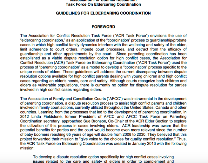 Sample find at NCSC under “AFCC” search (top search results) 2014 by ACR re: Eldercare Dispute Resolution GuidelinesClick here for whole doc’t. or image to enlarge (in 2 images)