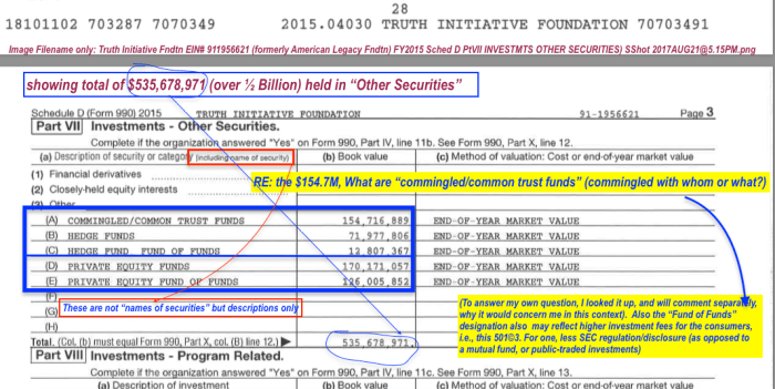 NAATPN, Inc (2000ff, Total Current Assets, $0) and Caffee, Caffee and Associates PHF, Inc. (Hattiesburg, MS, 2003ff, Total Assets $0, Tax Filings Questionable), and others trying to squeeze a California Race-Based Stop-Smoking Network (AATEN) into that recipe. [Publ. Aug. 28, 2017] » Truth Initiative Fndtn EIN# 911956621 (formerly American Legacy Fndtn) FY2015 Sched D PtVII INVESTMTS OTHER SECURITIES) SShot 2017AUG21@5.15PM