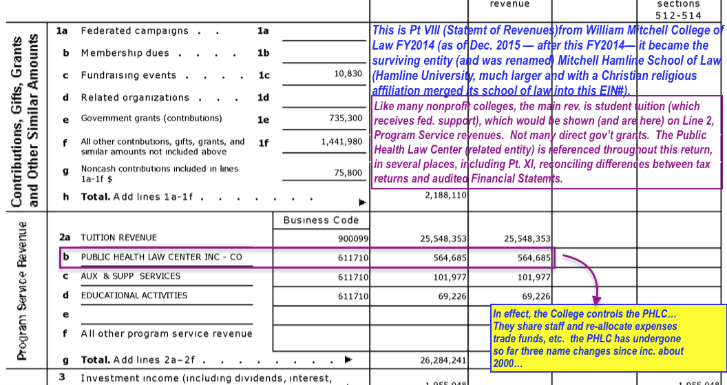 NAATPN, Inc (2000ff, Total Current Assets, $0) and Caffee, Caffee and Associates PHF, Inc. (Hattiesburg, MS, 2003ff, Total Assets $0, Tax Filings Questionable), and others trying to squeeze a California Race-Based Stop-Smoking Network (AATEN) into that recipe. [Publ. Aug. 28, 2017] » Wm Mitchell College of Law (final return under that name, FY2014) Pt. VIII Revs showing PHLC 564K SShot 2017-08-30 at 4.35PM