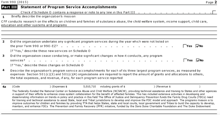 Excerpt from most recent CFFutures Form 990 (click image to enlarge, or here for the rest of the same tax return, EIN# 330731001. I see there is a related for-profit (taxable as corporation or trust) entity (same name just about, EIN#75-3036330, in Lake Forest, CA). This entity is 4/5 (of revenues about $5M) government funded, no independent contractors. Notice the statement of Program Service Activities references other tax-exempt foundation sponsorships