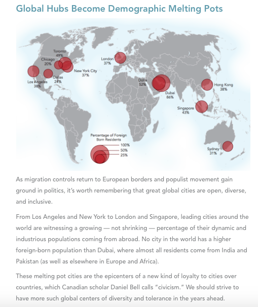 Global Hubs become Demographic Melting Pots” map, lead-in text (not pictured) reads: This map identifies the cities participating in just a small number of the more than 200 inter-city learning networks that are actively sharing best practices in every arena, from climate and safety to education and social inclusion. This is about the same number as inter-governmental organizations. Soon enough, “diplomacity”— diplomacy among cities— will supersede traditional diplomacy among states in importance.